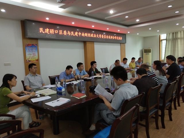 为促进会员之间的交流合作,全面发挥民建界别的履职能力,6月21日,民建武汉市硚口区委与民建中南财经政法大学委员会友好合作交流会在民建硚口区委会议室召开。中南财经政法大学党委统战部副部长畅安平,民建中南财经政法大学委员会主委张志宏,副主委陈晓星、谢艳明,民建硚口区委副主委杨莉华、黄旭、贾洪武,挂职副主委刘绮霞及双方骨干会员20余人出席交流会。
