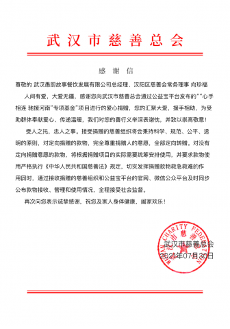 民建汉阳区会员、武汉愚厨故事餐饮发展有限公司总经理向珍福获悉河南灾情后,马上与武汉市慈善总会联系协调,捐赠了善款3000元,转入由武汉市慈善总会“心手相连 驰援河南”专项基金账户。