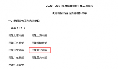 民建湖北省委荣获民建中央2020-2021年度新闻宣传工作先进单位一等奖。