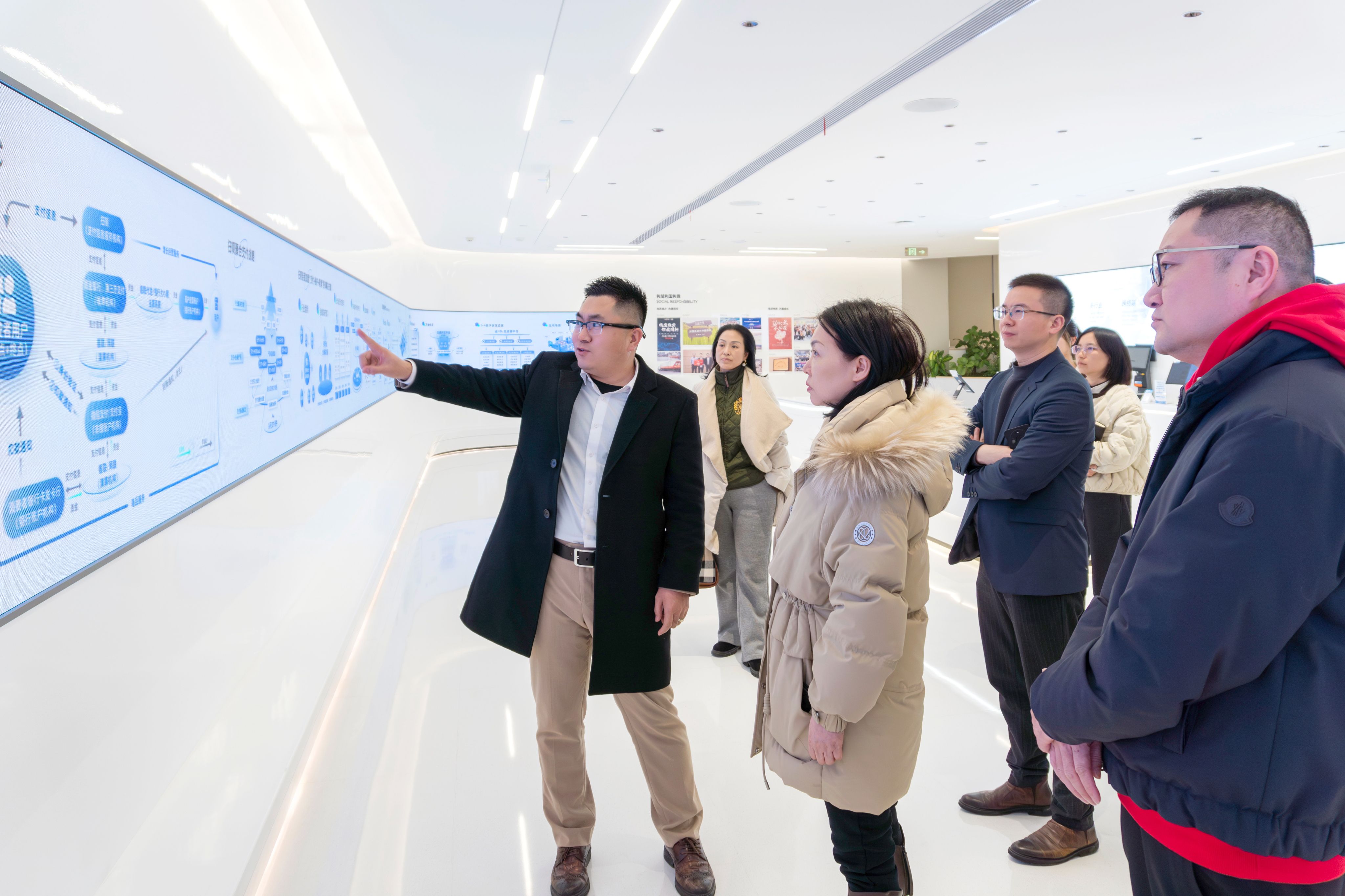 在民建会员、利楚商服联合创始人兼高级副总裁蒋文龙的陪同下,调研组实地参观了公司数字化展厅,详细了解企业发展历程、核心产品、业务布局及创新成果。利楚商服成立于2011年,历经14年深耕,已成长为国内聚合支付领域的知名企业,旗下品牌“扫呗”为全国150万家商户的220万个门店提供智慧经营服务,累计服务国内用户8.5亿人次。公司先后荣获武汉市突出贡献民营企业、湖北省专精特新“小巨人”企业、武汉市第一批企业研究开发中心、国家高新技术企业、湖北省瞪羚企业、湖北省省级电子商务示范企业等多项荣誉,并入选武汉市上市后备“金种子”企业名单,展现出强劲的创新活力和发展潜力。