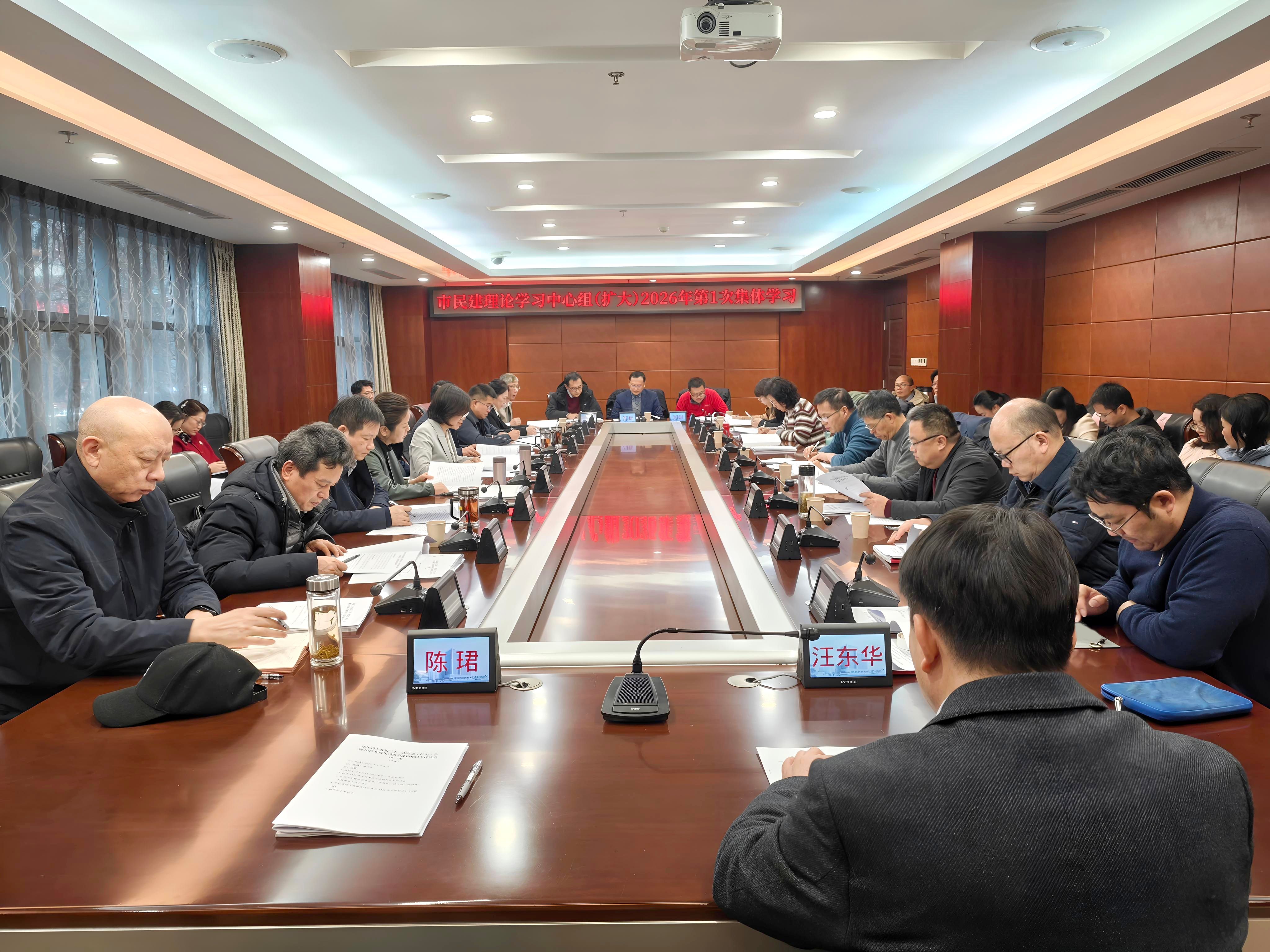 2月6日,民建武汉市委会理论学习中心组(扩大)开展2026年第1次集体学习,武汉市人大常委会副主任、民建武汉市委会主委穆书芹主持并讲话。副主委张再强、张智、吴立群、刘成奎,专职副主委徐莉,秘书长徐敏出席会议。全体常委,不担任常委的区级组织主委、部分副局级会员干部以及市委会机关各部室负责人参加学习。