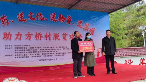 2020年10月16日,在全国第七个扶贫日到来之际,市委统战部组织各民主党派市委会、市党外知识分子联谊会及新的社会阶层人士分会成员赴蕲春县大同镇方桥村开展了以“送医药、送文化、送物资、送温暖”为主题的“扶贫日”活动。虽然秋雨连绵、寒意袭人,但是活动现场气氛高涨,帮扶慰问队成员和村民们的脸上都洋溢着幸福的笑容。