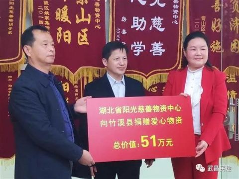民建会员单位湖北省阳光慈善物资中心向竹溪县捐赠51万元爱心物资